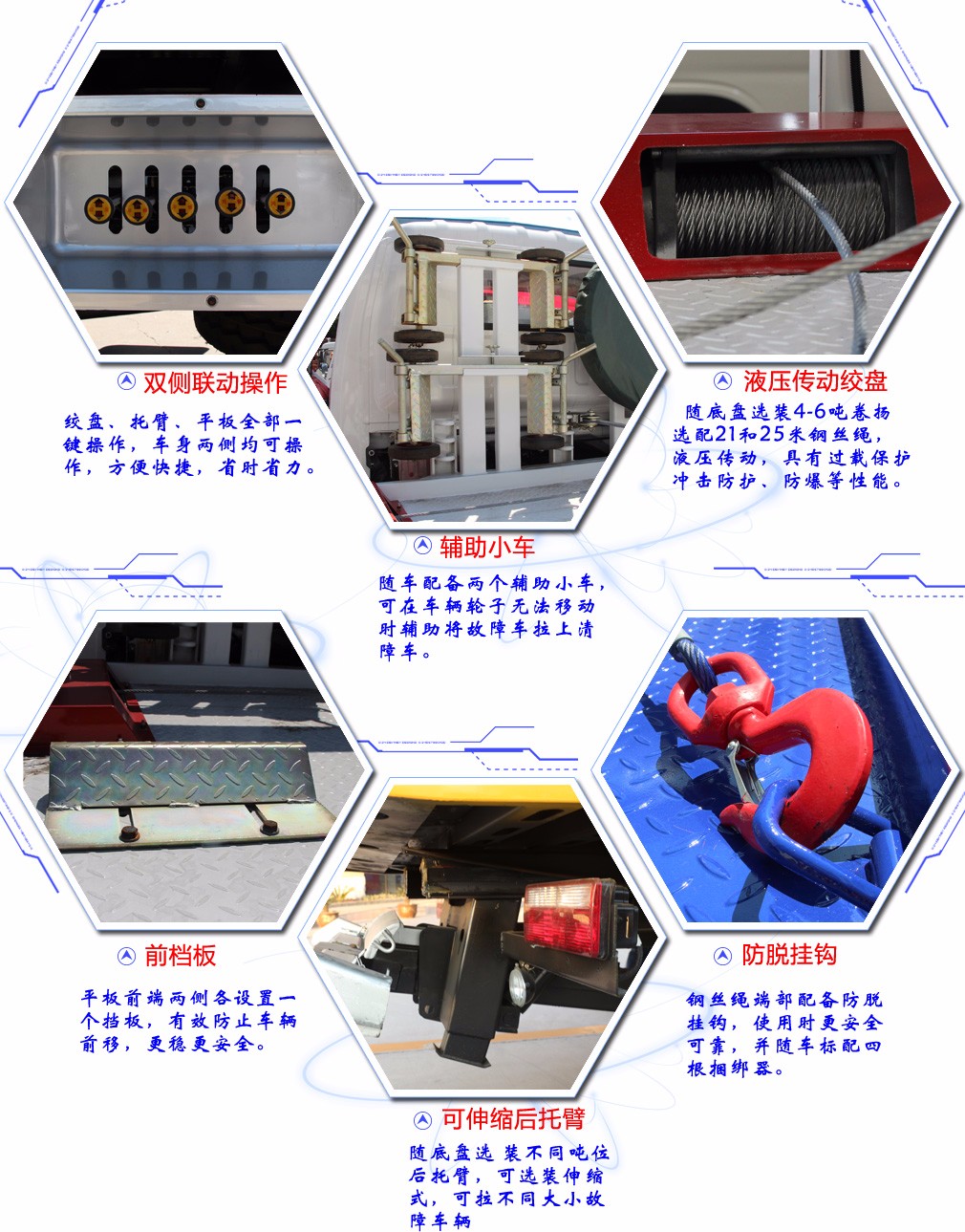 清障配置:平板尺寸:5600X2300(mm),5mm厚碳钢冲压凸纹防滑板制作,3P2A折叠冲压式平板,12根加强横梁固定,液压油缸行程2.7米,4吨液压绞盘(25米钢丝绳),托臂**大有效长度3.3米,托臂工作行程1.34米,托臂**大托举重量3吨,托臂**大牵引重量8.5吨,(采用意大利进口多路阀、平衡阀,德国力士乐技术液压油缸、液压接头,全进口密封圈),两侧双连操作杆,LED**示灯带喊话器,两个车架**示灯,1个工具箱,一个洗手箱,配两个小车(**轮),6根捆绑带,L型抱胎架一对,托叉一对,托叉座一对,颜色可选装工程黄。该车手续齐全,有环保,全国各地均可放心上户,上黄牌。